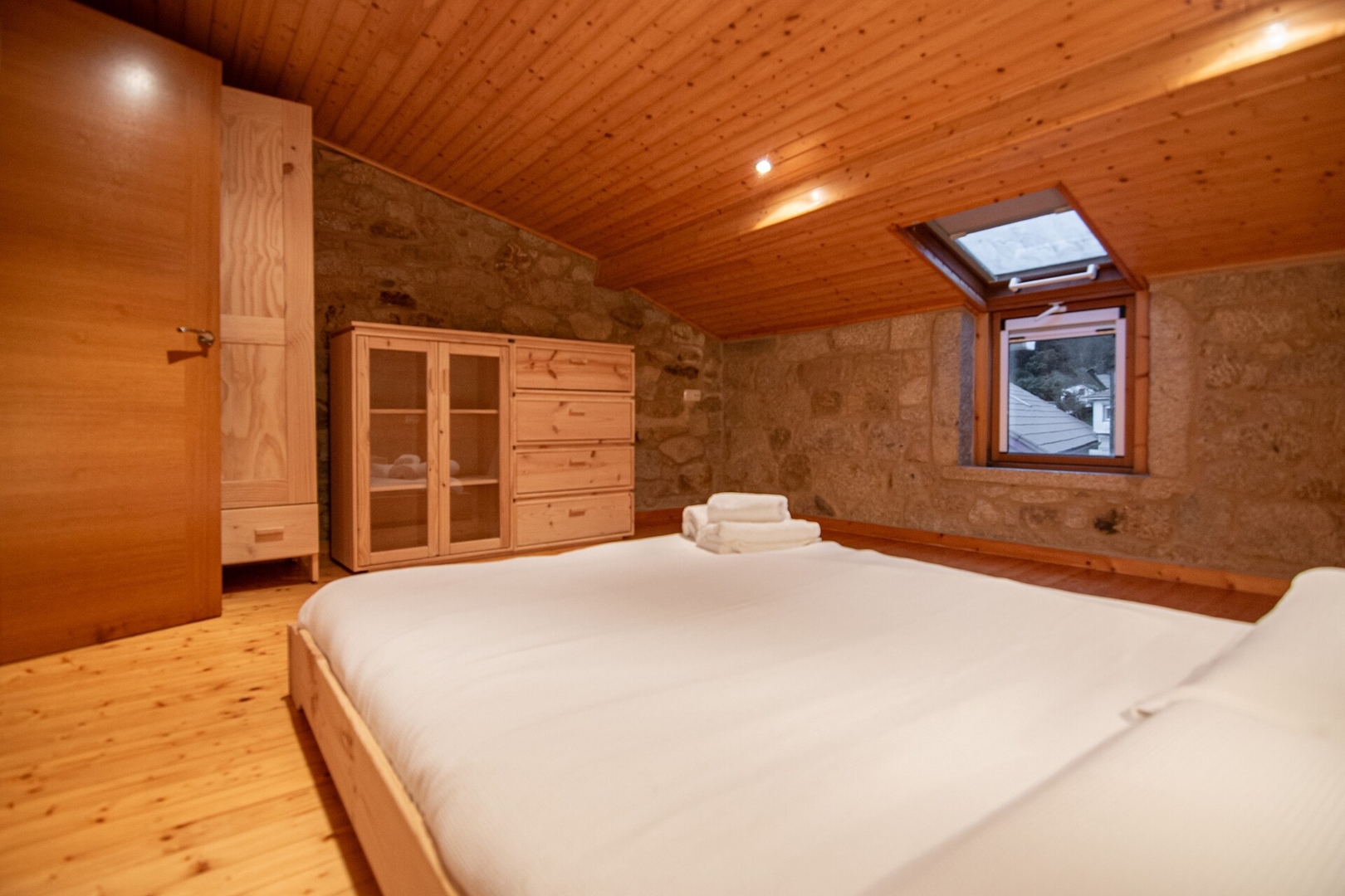 Upstairs, there are three bedrooms. The main bedroom has a double bed, another with a bunk bed for three people (the lower bed is a double and the upper one a single), and a third large bedroom with a double bed and two singles.